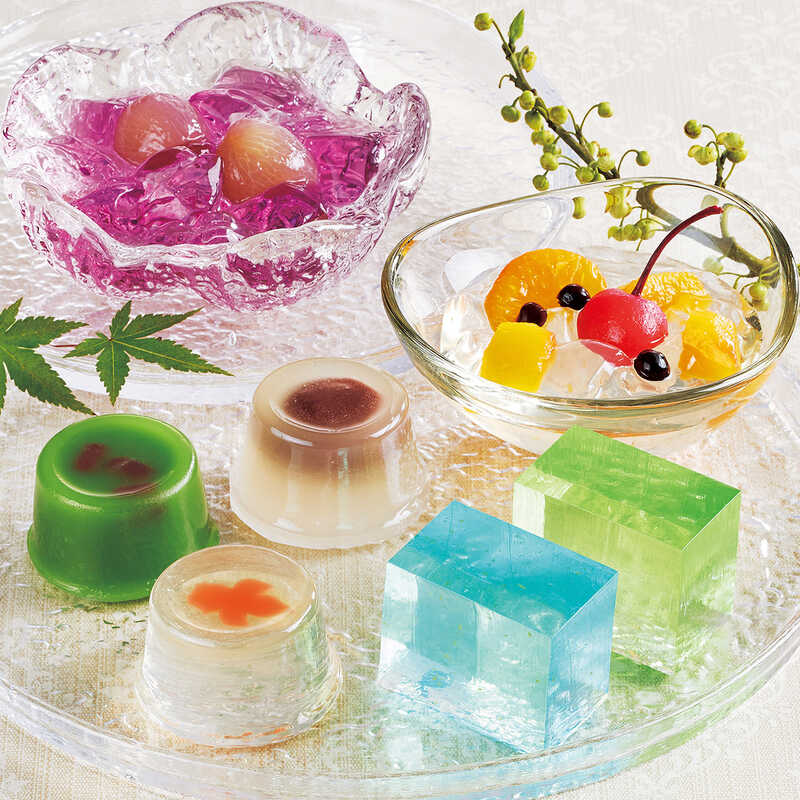 美しい彩りの蜜豆羹やさっぱりとした味わいの日向夏の葛切と2種類(蜜柑・葡萄)の果物のゼリー。